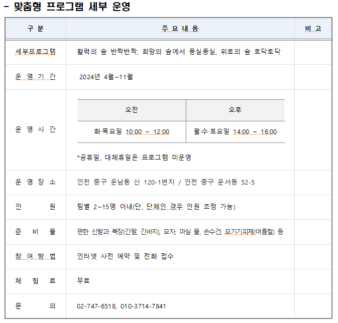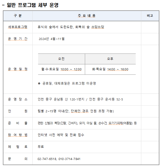 - 날씨(폭염, 폭우, 초미세먼지 등)에 따라 프로그램 진행은 취소될 수 있습니다.