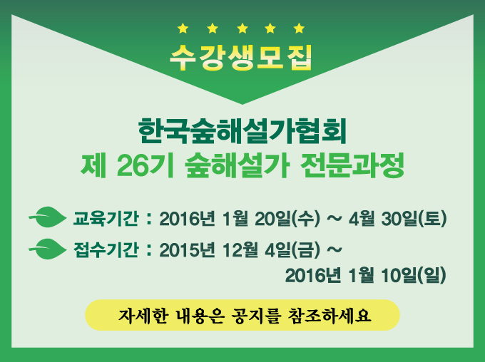 2016년 1차 제26기 숲해설가 전문과정 교육생을 아래와 같이 모집하오니 많은 지원 부탁드립니다.