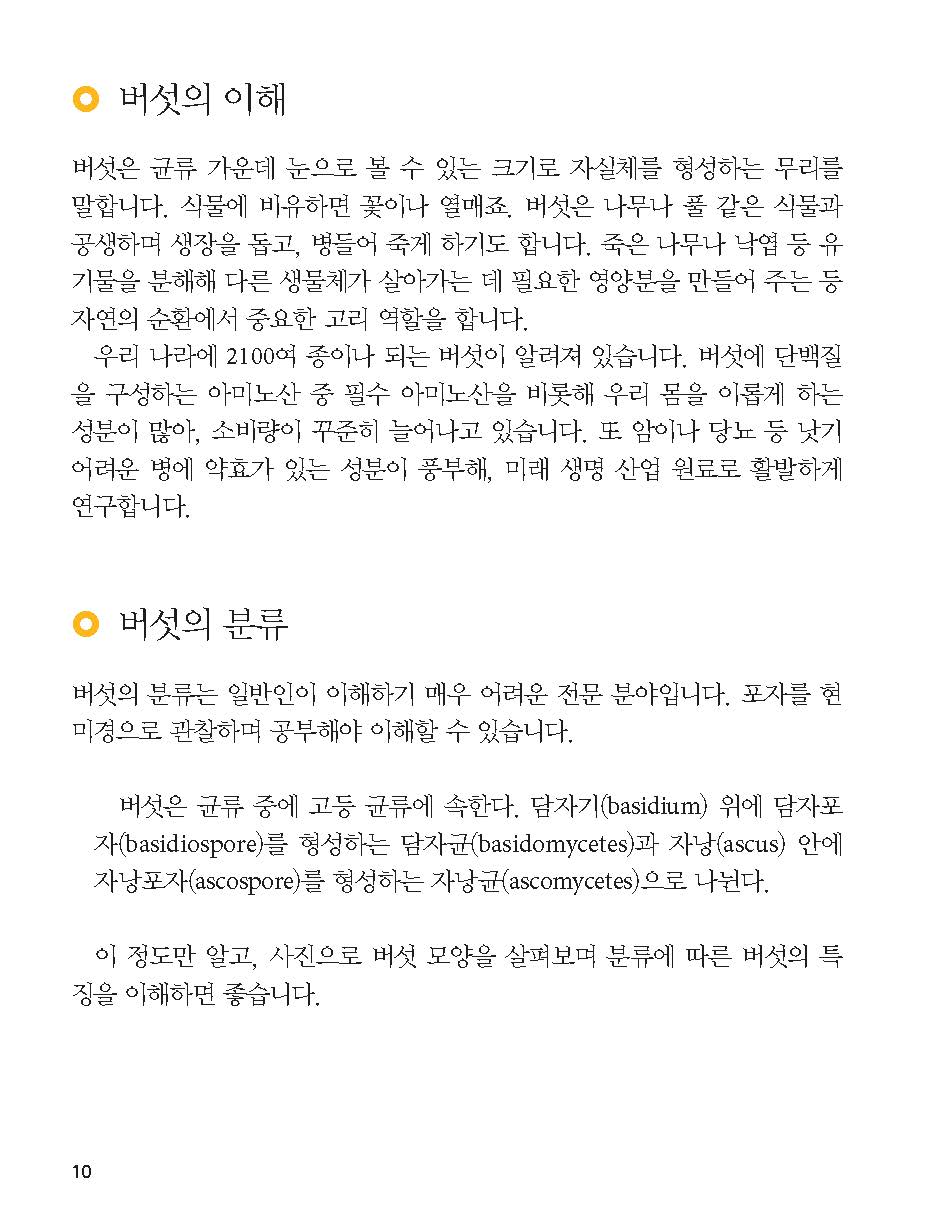 숲은 물론 동네 공원이나 길가에서 만날 수 있는 버섯 220종을 소개했다. 버섯 모양과 성장 단계별 특징을 담은 생태 사진 1100장을 싣고, 버섯이 나는 때와 곳, 생태적 특성까지 알기 쉽게 설명했다.