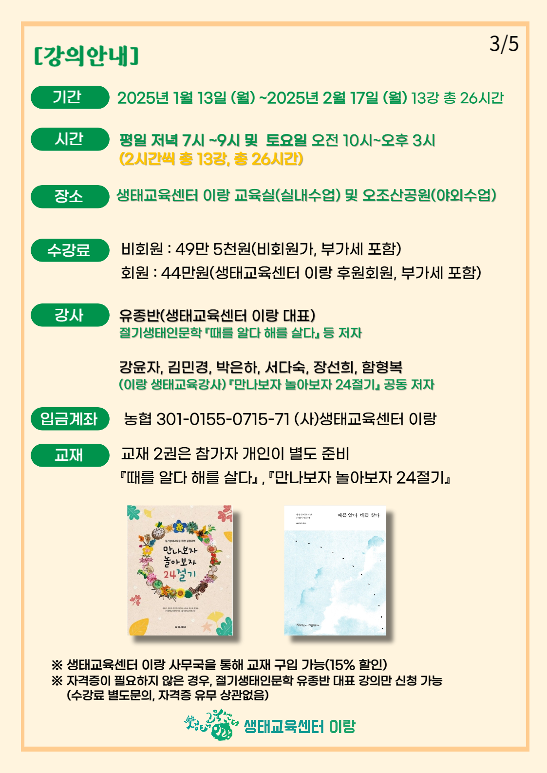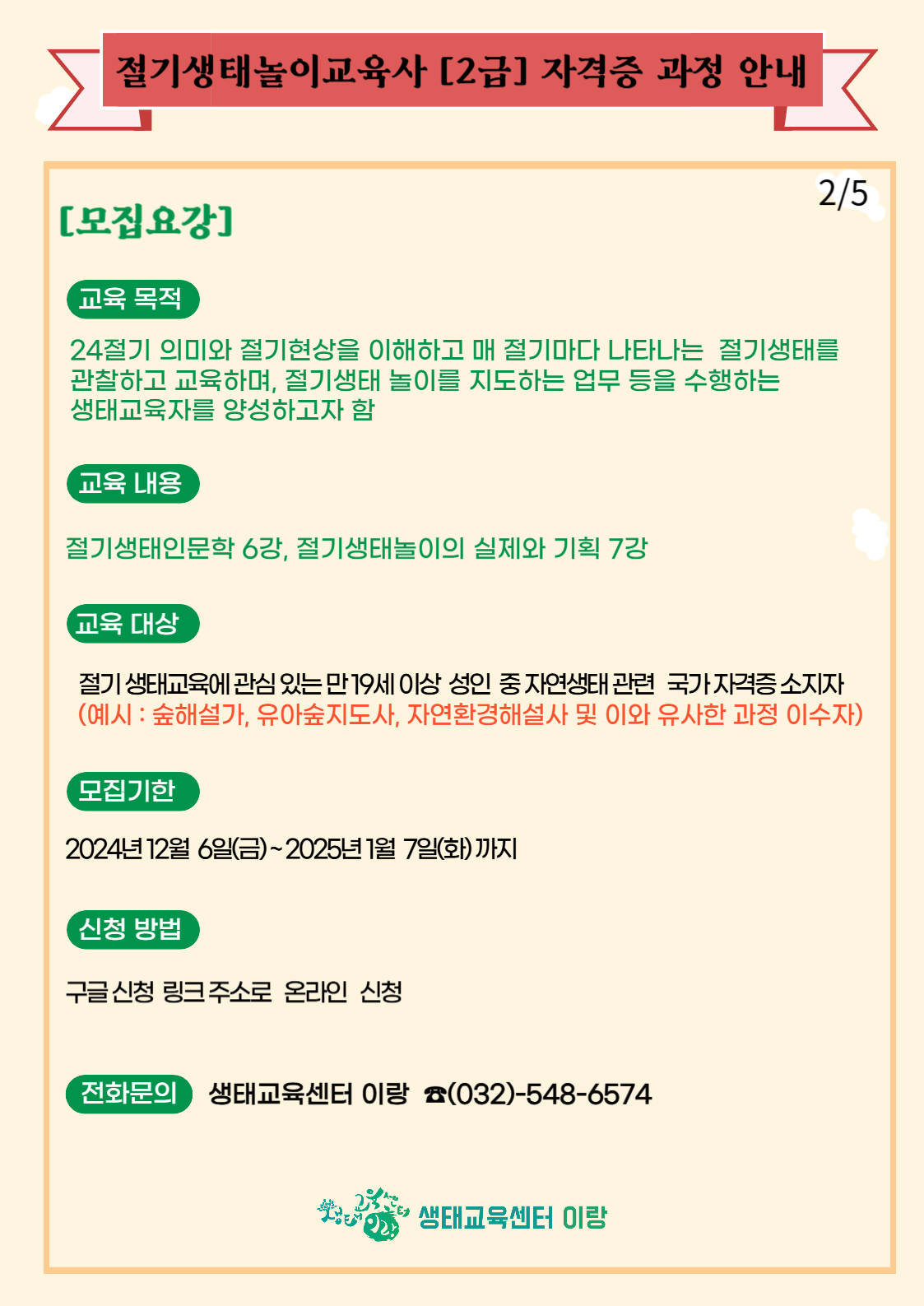 (사)생태교육센터 이랑이 2024년 11월 ‘절기생태놀이교육사’ 민간자격관리기관으로 등록됨에 따라 다음과 같이 2급 양성과정 교육생을 모집하오니 관심 있는 분들의 많은 신청 바랍니다.
