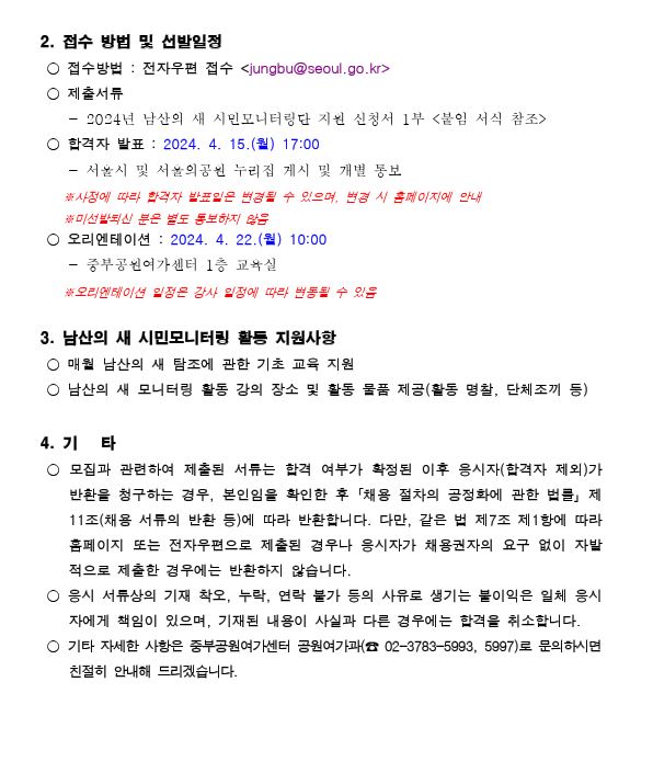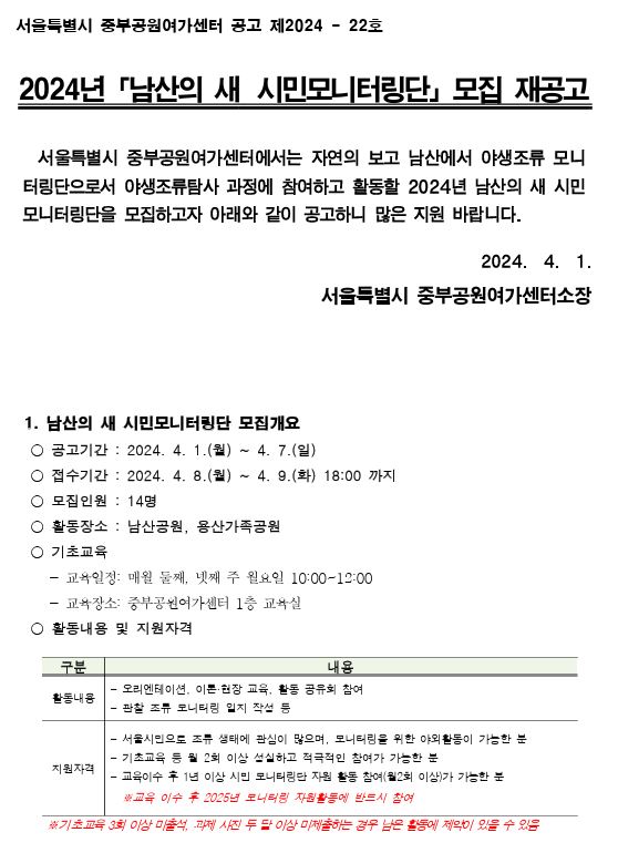 2024 서울시중부공원여가센터 남산의새 시민모니터링단 모집안내입니다(자원활동가)